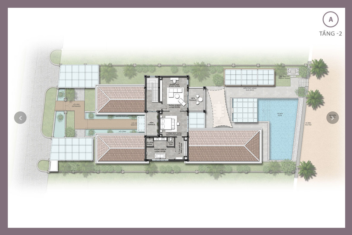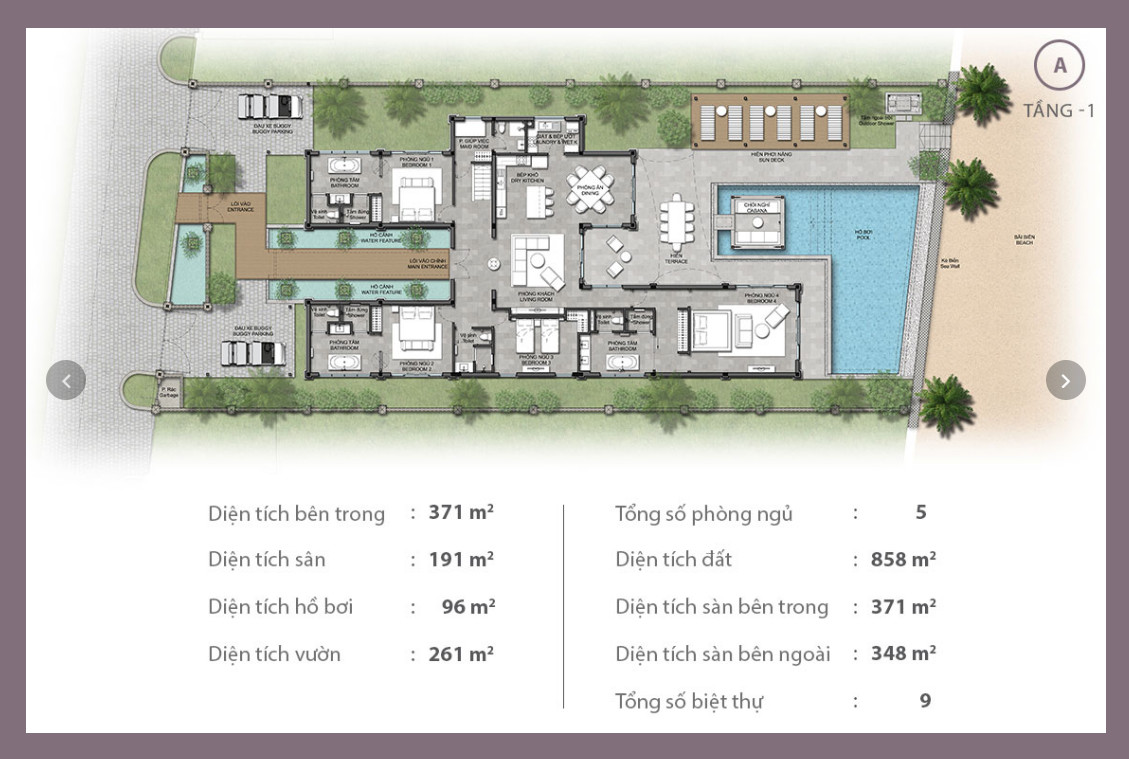 2 stories villa surround by green, coconut trees and the ocean water, the land area is over 800m2, with 5 bedrooms.